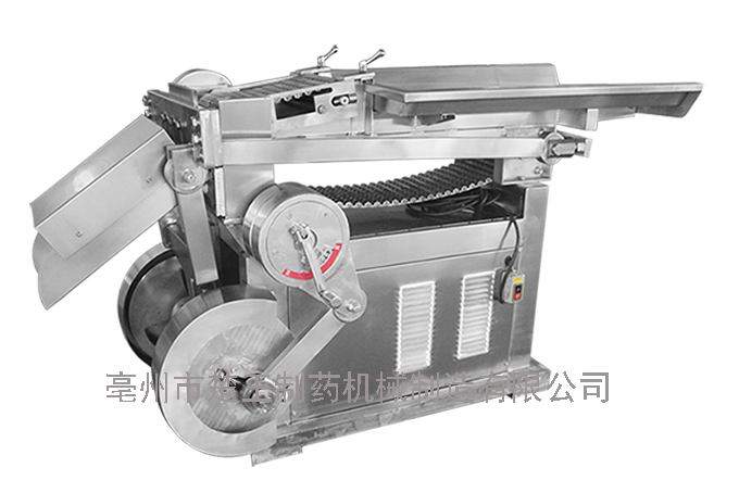 采用机械传动,经输送带自动将药物传送到出料口,上下直线运动的切刀在出料口处切断药物。